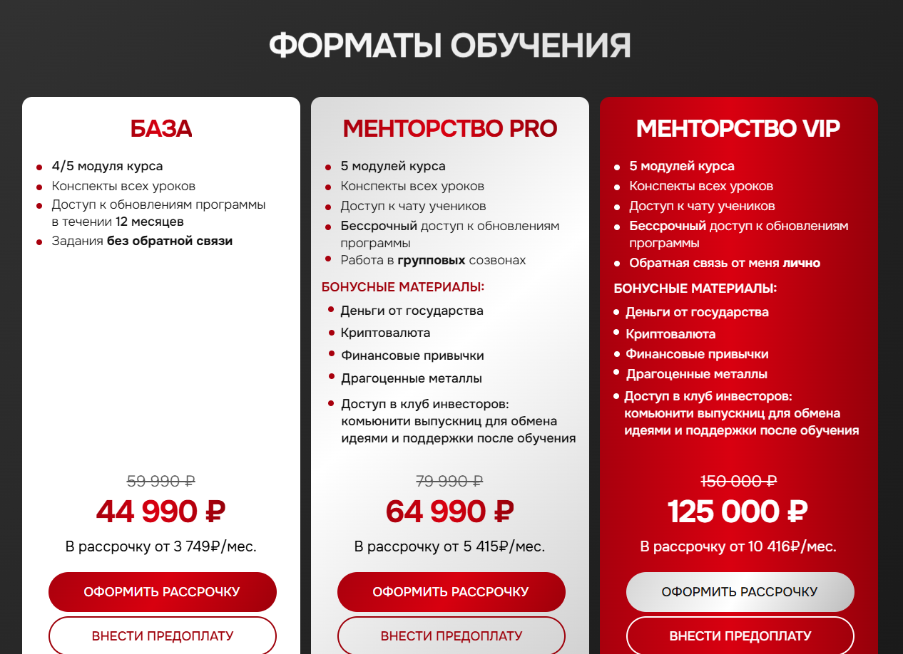 Образовательные курсы представлены в трех тарифах: БАЗА за 44 990 рублей, МЕНТОРСТВО PRO ЗА 64 990 рублей и МЕНТОРСТВО VIP за 125 000 рублей. Насколько программы могут быть эффективны – неизвестно. Образование Олеси действительно подтверждено, но реальный опыт в инвестировании остается под вопросом.