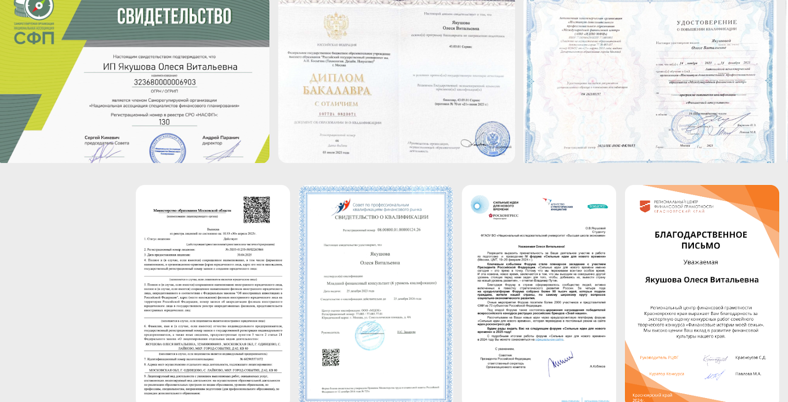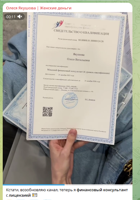 Себя девушка называет финансовым консультантом с лицензией. Но вот сведений о наличии конкретно лицензии нет ни в постах в социальных сетях, ни на сайте школы Investutka ru. Да, Олеся приводит в качестве доказательств такой документ, как свидетельство о квалификации, но это – не лицензия. Финансовые консультанты не обязаны иметь лицензию.