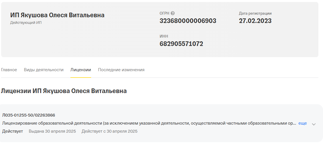 Но при этом регистрация у девушки есть. У ИП Якушова Олеся Витальевна прописаны не только необходимые ОКВЭД, но есть и лицензия на образовательную деятельность.