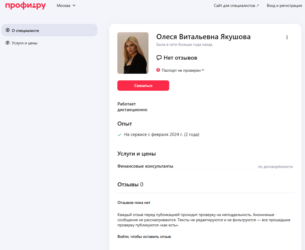 У девушки есть аккаунт на платформе Профи ру, который, как видно по отметке, она не посещала уже более 1 года. О консультациях от автора также нет откликов: