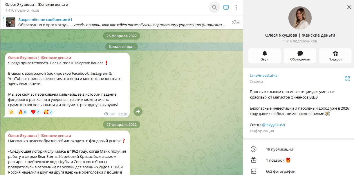 Девушка ведет блоги в Телеграм и MAX, а также имеет страницы и на других платформах. На сообщество Олеся Якушова Женские деньги (Investutka) в Телеграм подписано чуть более 1,4 тысячи пользователей, посты просматривает более 10% от аудитории. Вероятно, обошлось без применения накрутки.