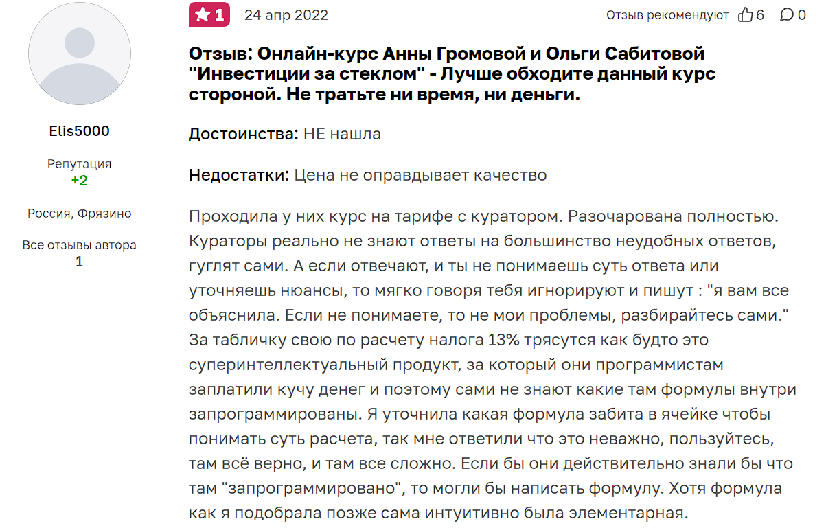 Учитывая отзывы о курсах Ольги Сабитовой и результаты проверки от нашей редакции, сотрудничать с инвестором не рекомендуется. Девушка и сама теряется в терминах, зато вовсю впаривает свои курсы доверчивой аудитории. Они могут быть полезны новичкам, но отдавать за них порядка 200-300 тысяч рублей точно не стоит.
