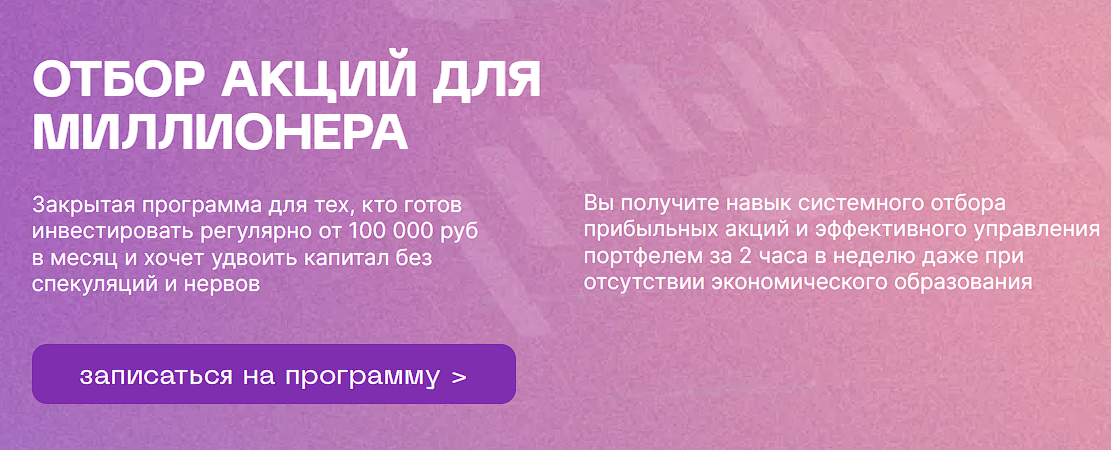 • «Отбор акций для миллионера». Курс был запущен еще в 2021 году и продается по сей день. Программа посвящена изучению навыков системного отбора акций и эффективного управления инвест-портфелем. Курс ориентирован на опытных инвесторов, которые уже разбираются в торговых направлениях и готовы выделять от 100 тысяч рублей на инвестирование. Само обучение обойдется в 210 000 RUB. Доступна рассрочка на три платежа по 70 тысяч рублей.