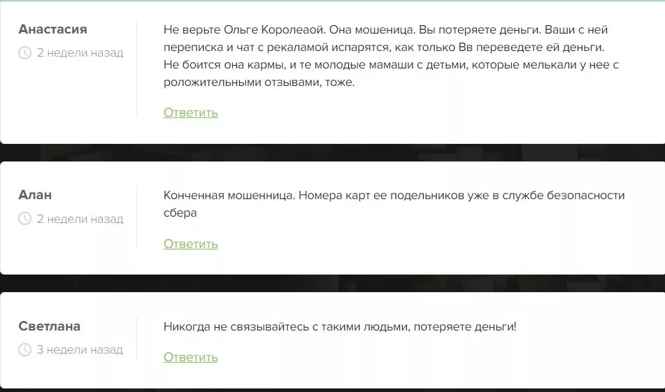 Пользователи открыто жалуются на мошенницу и делятся негативным опытом сотрудничества. Они утверждают, что после перевода денежных средств Ольга сообщает об успешной сделке и требует выплатить дополнительный процент (якобы банковскую комиссию). Затем пользователь отправляется в блок.