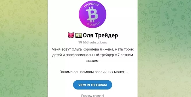 Информации о трейдере немного. Женщина преподносит информацию дозированно. Указано, что она – мать троих детей и трейдер с большим опытом работы. Она зарабатывает на пампе монет. Телеграм-канал Ольги Соколовой пользуется популярностью среди молодых мам в декрете. Именно на эту аудиторию и нацелена мошенница. Она утверждает, что высокий заработок возможен при минимальной занятости.