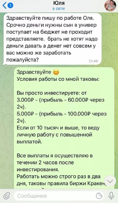 Ольга Соколова – это финансовый деятель и администратор одноименного Телеграм-канала Ольга преподносит себя как эксперта по инвестициям и предлагает подписчикам быстрый, и, что самое важное, безопасный доход. Соколова раскручивает небольшие депозиты и превращает их в баснословные суммы. Пользователи обращаются к мошеннице в надежде на солидный профит.