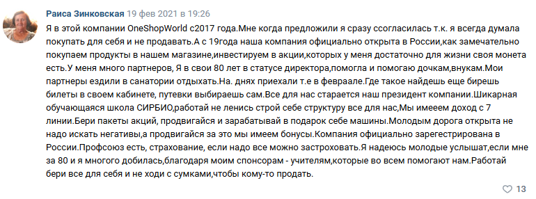 На официальных ресурсах и на странице ВКонтакте компании преобладают положительные отзывы о One Shopw, явно написанные активными реферерами. Они насыщены шаблонными фразами о «больших перспективах» и «поддержке со стороны руководства».