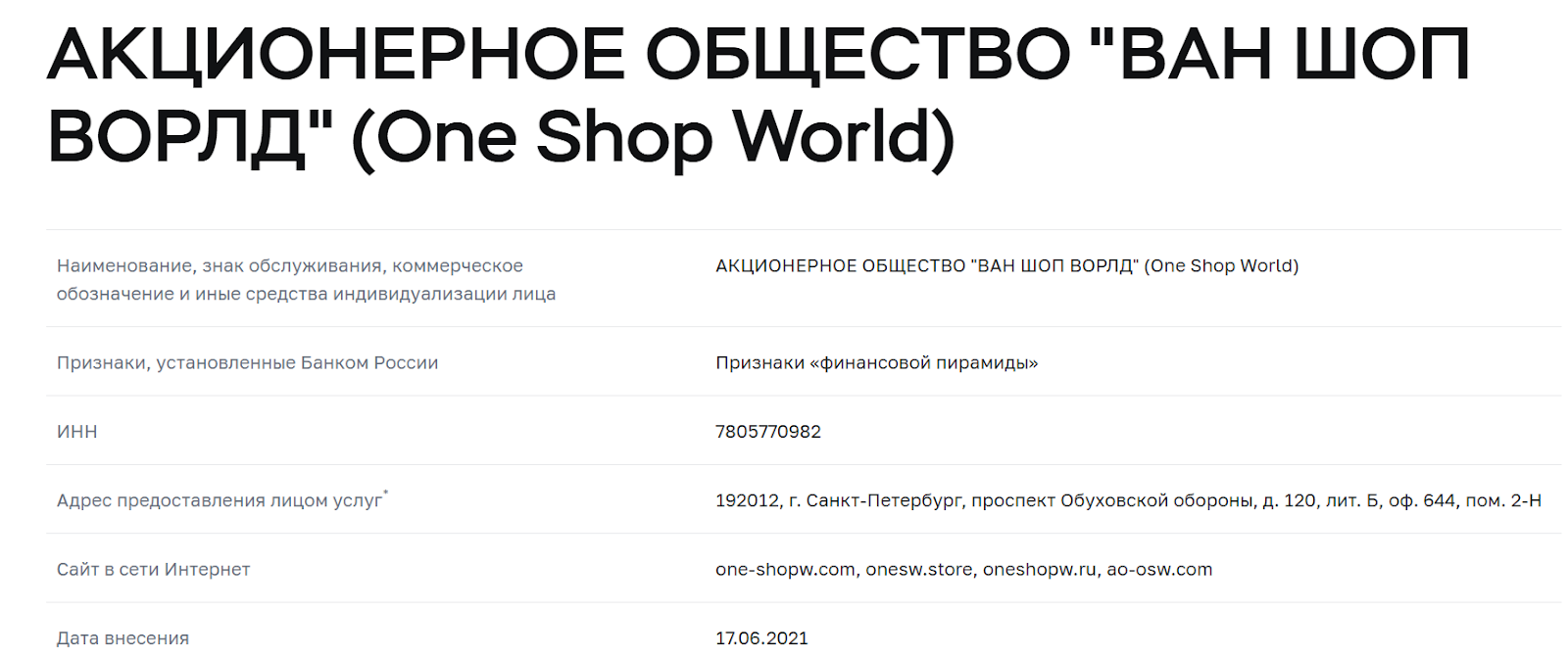 One Shop World включен в черный список Центрального банка РФ как подозрительной организации, ведущей нелегальную финансовую деятельность. Это ставит под сомнение любые заявления о надежности и перспективах сотрудничества. При переходе на сайт oneshopw ru пользователи видят предупреждение о потенциальном мошенничестве.О руководстве компании известно мало – официально ею руководит Игорь Вавилов. Среди создателей проекта числится Владимир Солошенко. Он является автором пирамиды Едоша, о которой в интернете написано множество разоблачений.