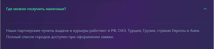 Главным преимуществом, по сравнению с другими обменниками, является работа с наличными. География довольно обширная заявлены все крупные города России, ОАЭ, Турции, Грузии, Европы и Азии. Для налички доступен такой fiat как доллары, евро, рубли, AED. Доставка ведётся только курьерской службой и работает по такой схеме: