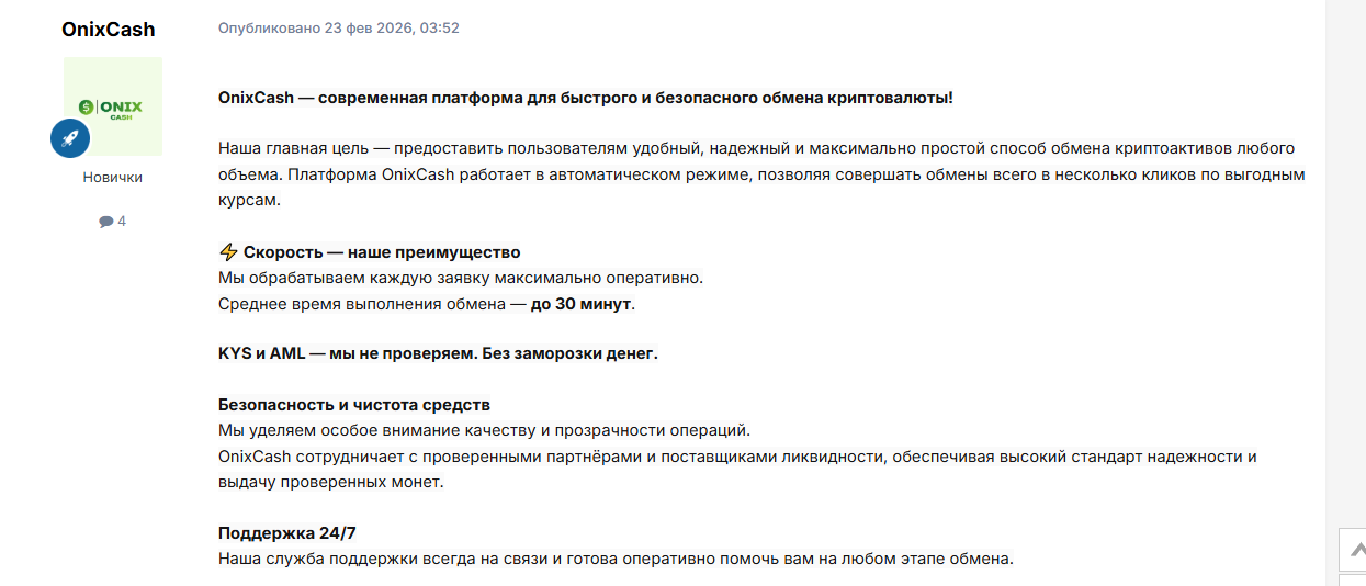 То, что обменник работает недолго, подтверждает и такой факт: информацию о нем на популярном форуме мониторинга Bits.media владельцы разместили 23 февраля 2026 года.