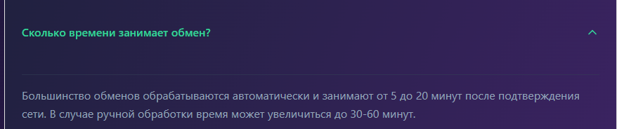 На валютнике OnixCash доступно два направления обмена: криптовалюта/рубль с выводом на банковские карты (Сбер, Т-банк, СБП, карта Мир, ЮМани) и крипта/крипта (заявлено 16 монет). По условиям, все сделки проходят в автоматическом режиме. На их обработку требуется от 5 до 20 минут после подтверждения сети. В некоторых случаях применяется ручная обработка, тогда время транзакций может занимать 30-60 минут.