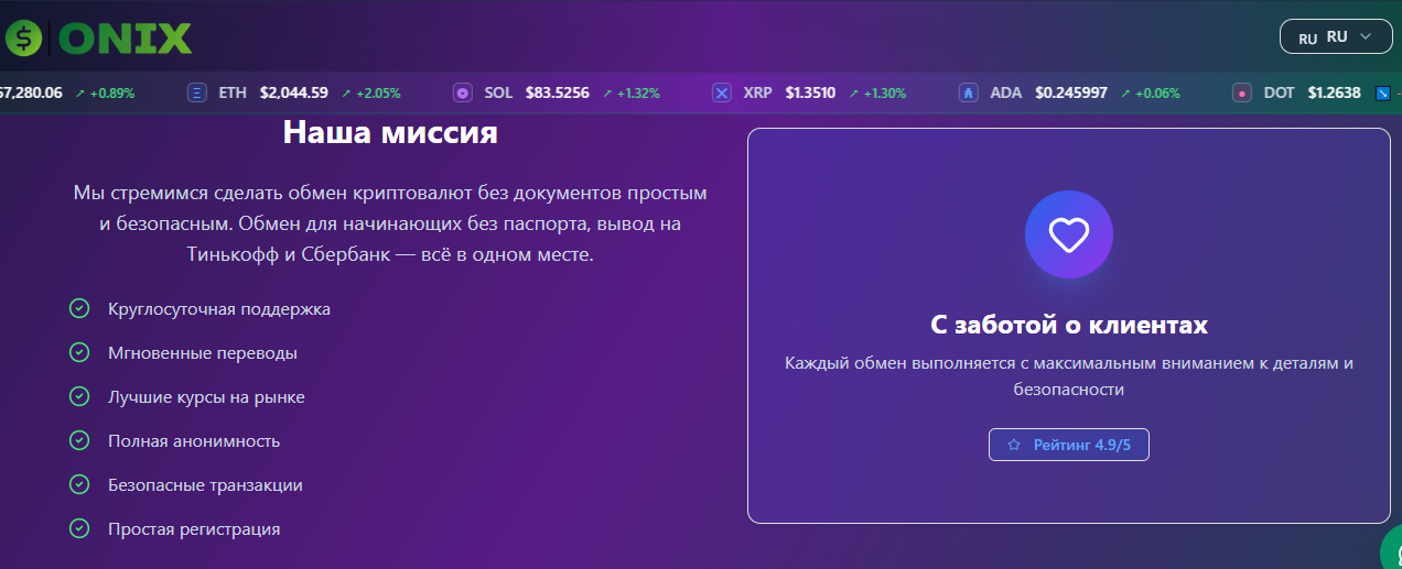 OnixCash позиционируется как универсальная платформа с “магическим” обменом криптовалют. Владельцы обещают полную анонимность (без AML/KYC), выгодный курс, быстроту и безопасность сделок. Мы провели расследование, чтобы получить достоверную информацию о сервисе ОниксКэш, реальных условиях обмена и узнать мнение клиентов. Выводы — в конце обзора.
