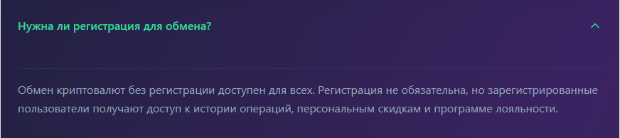 Регистрация для совершения обмена не является обязательным условием, но для зарегистрированных пользователей есть дополнительные бонусы и доступ к истории операции.