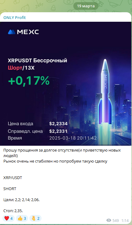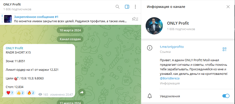 ONLY Profit – Телеграм-канал, на котором анонимный автор BorisBereza выкладывает сигналы для трейдинга на криптовалютных фьючерсах. Админ не предлагает платных услуг, не занимается обучением. Весь контент на канале бесплатный. Проверим, насколько безопасно прислушиваться к его сигналам в ходе обзора.