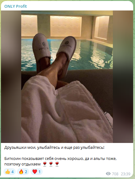 Большая часть публикаций посвящена сделкам. Но иногда автор выкладывал новости криптосферы. Не обходилось и без стандартных мотивационных постов, в которых демонстрировался лакшери стиль жизни админа.