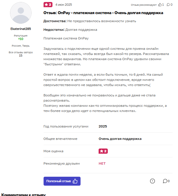Следующий пользователь заявляет, что работать с Onpay не удалось из-за клиентского сервиса. На вопросы ответов нет, а договор пришлось ждать около трех недель. Все выглядит безответственным и неорганизованным. Люди обвиняют сотрудников Onpay в регистрации фейковых аккаунтов на форумах для создания положительного имиджа.