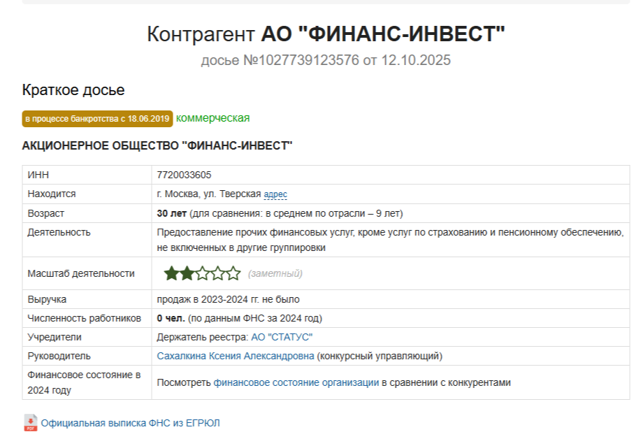 Инвестиционный проект «Финанс Инвест» появился в Москве 13 июля 1995 года. Уставной капитал данной организации составлял достаточно приличную сумму в 50 млн рублей. Активной финансовой деятельностью с переменным успехом компания занималась до 2018 года, когда случился серьезный инцидент с ценными бумагами и утрата активов клиентов. Оправиться от удара организация не смогла и 18 июня 2019 года инициировала процедуру банкротства. Однако данная процедура затянулась. Так как в организации 30 сентября 2022 года осуществилась смена управляющего на Сахалкину Ксению Александровна.На протяжении нескольких десятилетий компания «Финанс Инвест» работала по адресу г. Москва, ул. Тверская, д. 16 стр. 1, эт. 6, 125009. В 2023 году зафиксировали последнюю прибыль фирмы. Она составила 49 568 000,00 рублей. Сейчас компания не работает. Продолжаются суды.