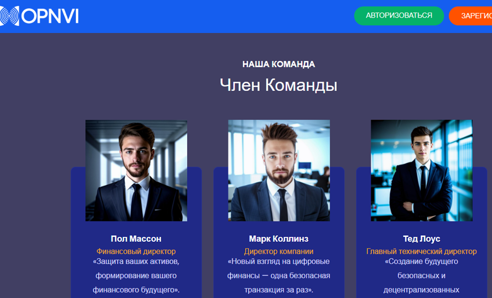 Opnvi com был создан в 2018 году. Уже через год была запущена онлайн-платформа, по крайней мере именно так сказано на официальном сайте проекта. На сайте кошелька даже дана информация о команде проекта, но являются ли эти люди реальными – остается загадкой. Фото весьма похожи на картинки, сгенерированные нейросетью.