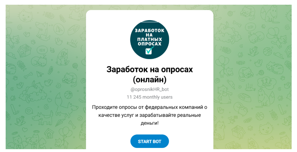 Сервис Oprosnikhr Bot – это был Telegram-бот, где предлагали зарабатывать на онлайн-опросах. По их словам, анкеты якобы шли от имени крупных федеральных компаний. Схема простая: отвечаешь на вопросы, получаешь вознаграждение. В описании делали акцент на легкий старт: опыт не нужен, навыки тоже. Все обещали оформить прямо в чате с ботом. Выплаты быстро и без лишних шагов, прямо в Telegram, как утверждали авторы. Именно так сервис себя и позиционировал.