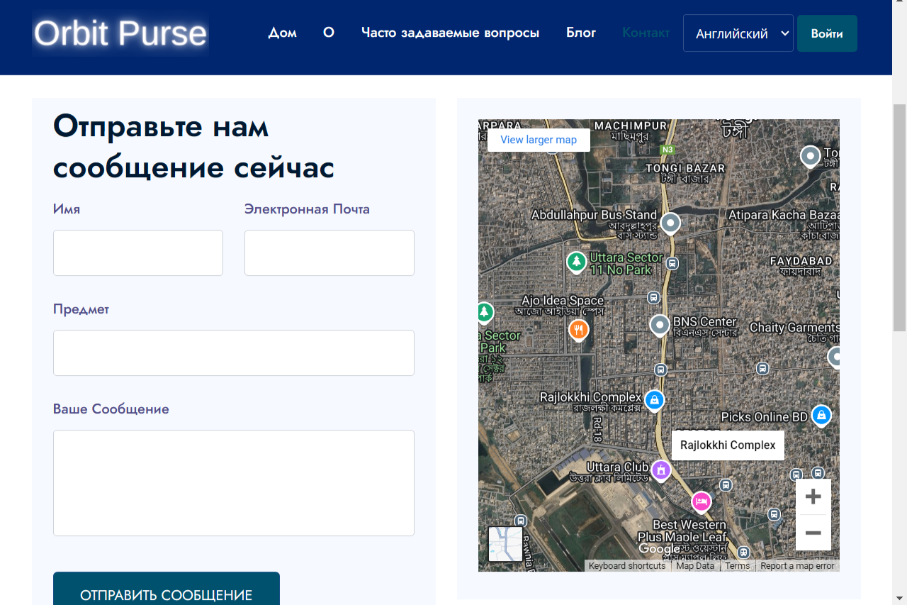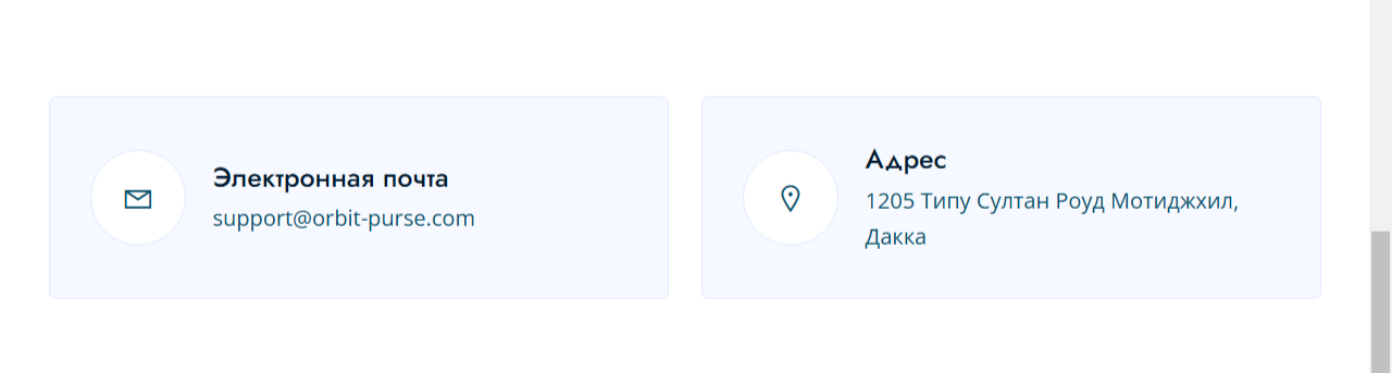 В качестве контактов для связи есть форма для фидбека, электронная почта support orbit purse com и адрес головного офиса.