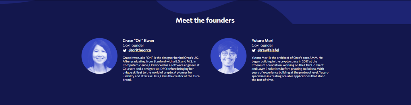 Orca so зарегистрировали в 2021 году два человека – Grace Kwan и Yutaro Mori. Они стали создателями первоначального дизайна, а также протокола маркет-мейкинга.