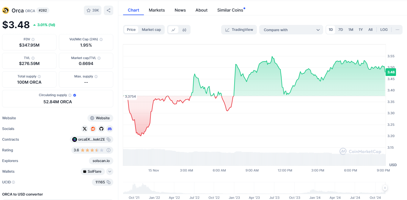 У платформы есть собственный токен, который не пользуется особым спросом и является достаточно волатильным. По рыночной капитализации ORCA занимает 282 место с показателем чуть более 180 миллионов USD.
