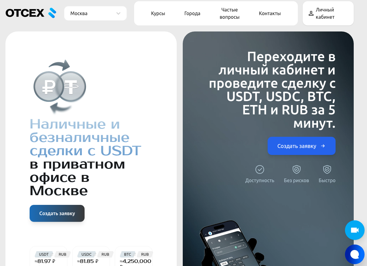 OTCEX (Отсекс) — внебиржевой обменник криптовалют, работающий с USDT, USDC, BTC и ETH. Принимает как наличные, так и безналичные расчеты, позиционируется как приватный сервис для крупных клиентов.