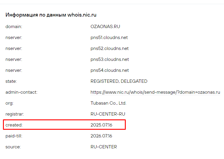 Домен озаонас ру зарегистрирован в июле 2025 года, что уже вызывает подозрение. Никаких официальных заявлений представители маркетплейса об этой компании не делали, то есть с «Озоном» она не связана.