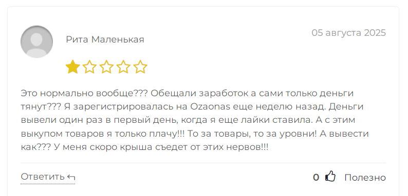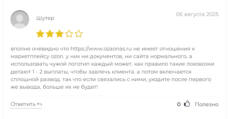 В отзывах пользователей про Ozaonas в телеграм-каналах писали, что аферисты просто использовали логотип компании Ozon и дизайн платформы. На начало августа 2025 года при попытке открыть сайт браузер выдает ошибку, то есть их преступную деятельность быстро пресекли.Почему в компании Ozaonas нельзя было заработать деньги