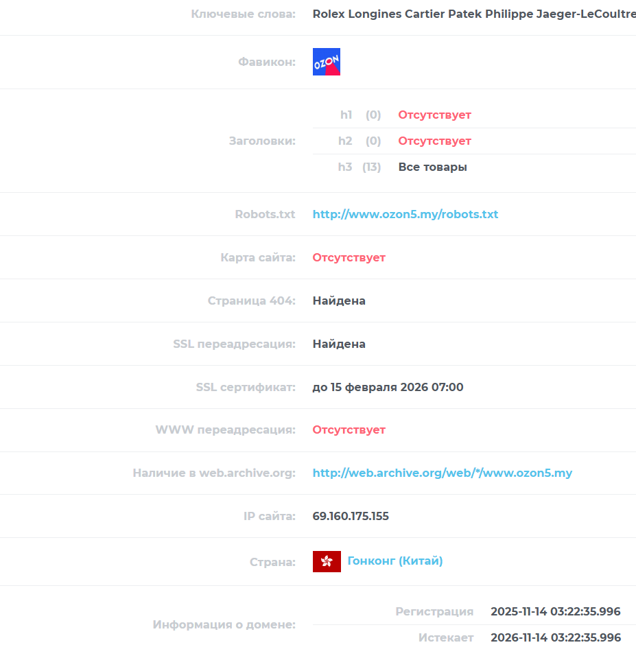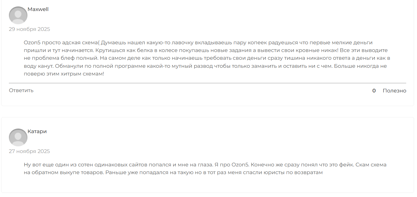 «Озон5» утверждает, что работает уже 15 лет. Домен зарегистрирован только в ноябре 2025 года. На самом деле это обычная мошенническая компания-однодневка. Они часто меняют адреса и названия.