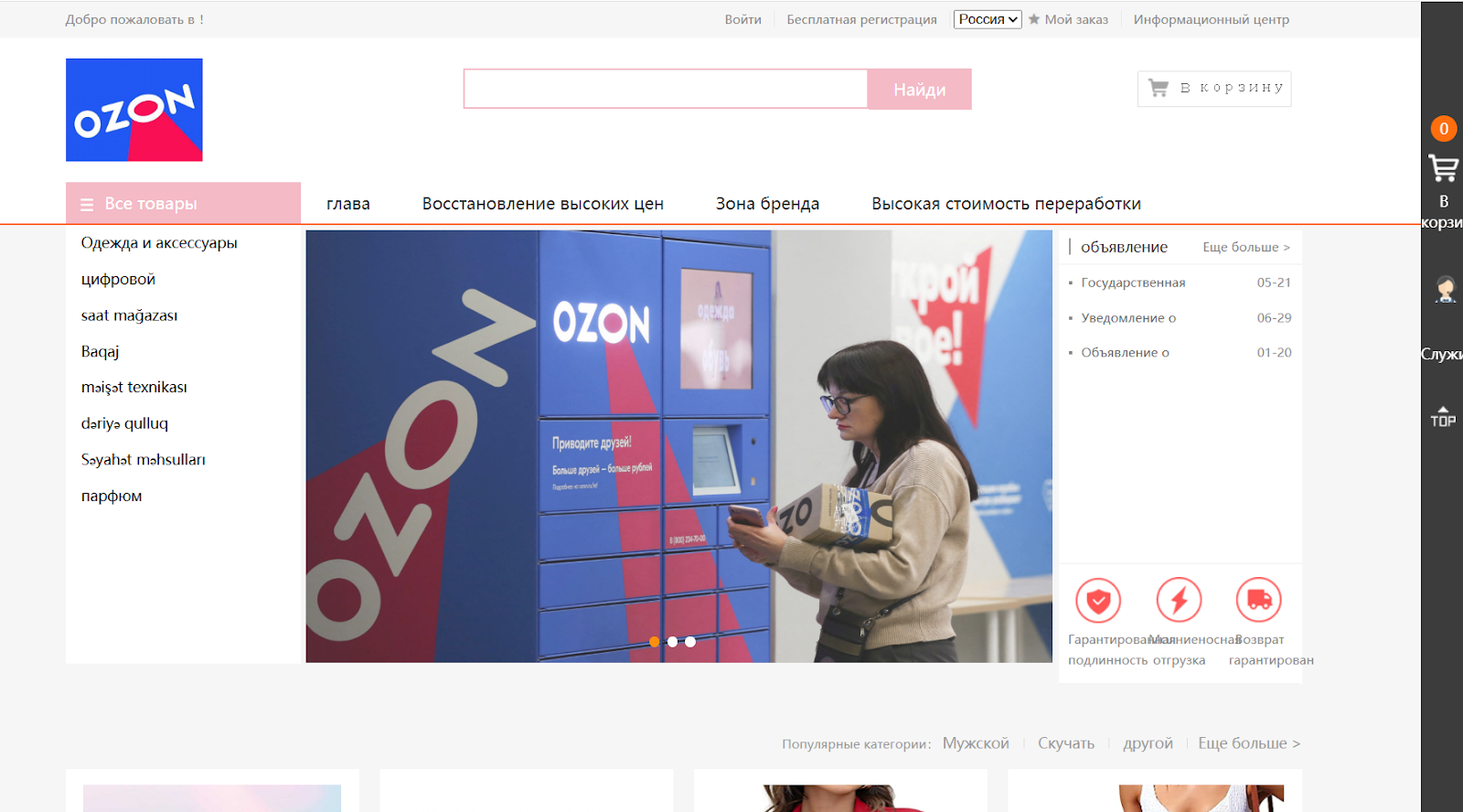 Первое, что бросается в глаза – нелепый, грубо сделанный сайт с логотипом франшизы Ozon. Некоторые вкладки не открываются, а фразы вроде «восстановление высоких цен» смотрятся как непрофессиональный перевод с китайского на русский. Сложно поверить, что раскрученный современный маркетплейс имеет хоть какое-то отношение к этой компании. Так и есть, Ozon5 my не упоминается как партнер корпорации на официальном сайте и в приложении.