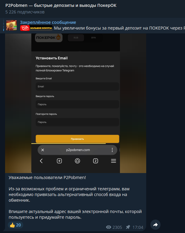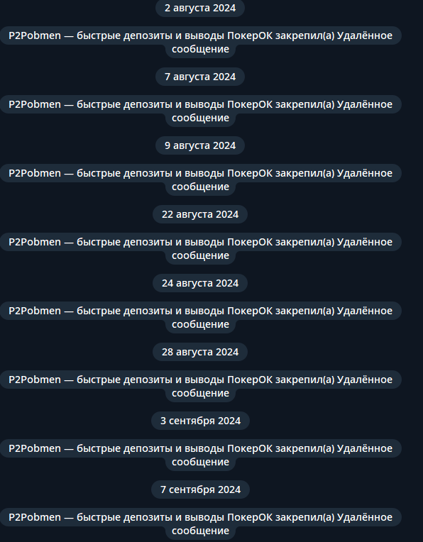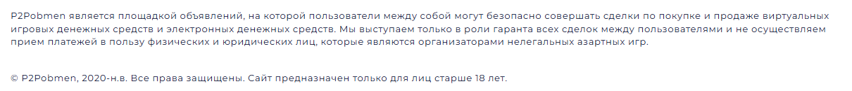 P2Pobmen — это якобы запущенная в 2020 году площадка, где пользователи размещают объявления о продаже и покупке виртуальных денег в одной из крупнейших покер-рум сетей СНГ. Сервис выступает посредником и гарантирует безопасность сделок между юзерами.