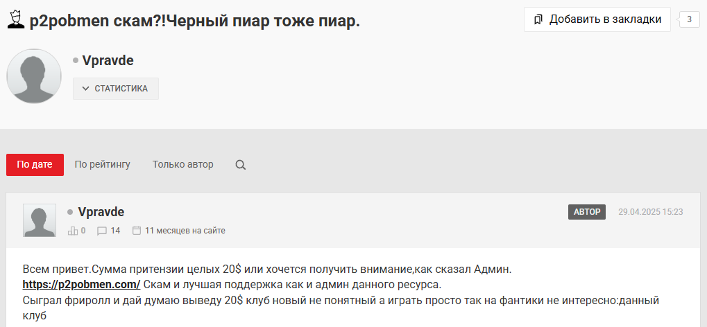 В интернете можно найти спорные отзывы о P2Pobmen Com. Мы обнаружили целый материал, где юзер жалуется на сервис. Он рассказывает, как выиграл $20 во фриролле в новом покер-клубе и попытался вывести деньги. Обнал даже подтвердили и списали фишки, но потом отменили. Поддержка заявила, что без депозита заказать выплату не получится, а затем удалила переписку и заблокировала пользователя. Через посредника админ пообещал вывести деньги в течение 3 дней, но в итоге тоже почистил диалог.