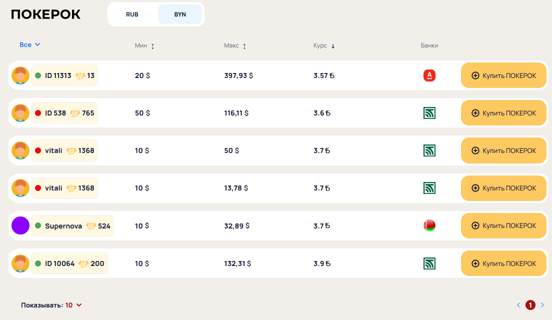 Приобретение игровой валюты в BYN тоже возможно, но выбор продавцов в разы меньше: вместо 10+ страниц в RUB здесь отображается только одна, и то неполная.