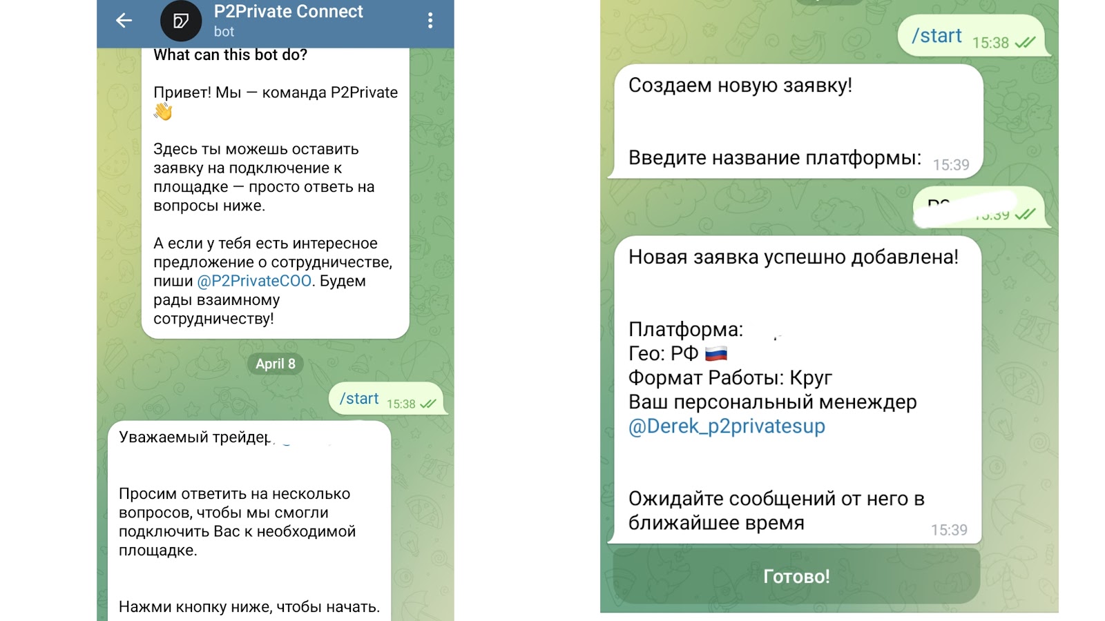 На сообщество P2PrivateOFF подписано более 600 пользователей. Здесь админы публикуют информацию про биржи и возможность с ними заработать. Основатели пишут условия сотрудничества с проектом (страховой депозит, оборотный депозит), точки входа, выхода.Для того чтобы подключиться к предложенным площадкам, нужно перейти к боту проекта. После его запуска, нужно ответить на несколько вопросов: название биржи, страну, а также формат работы (круг, вывод и прочий). Далее создатели P2private отправят аккаунт персонального менеджера и попросят ожидать от него сообщений.