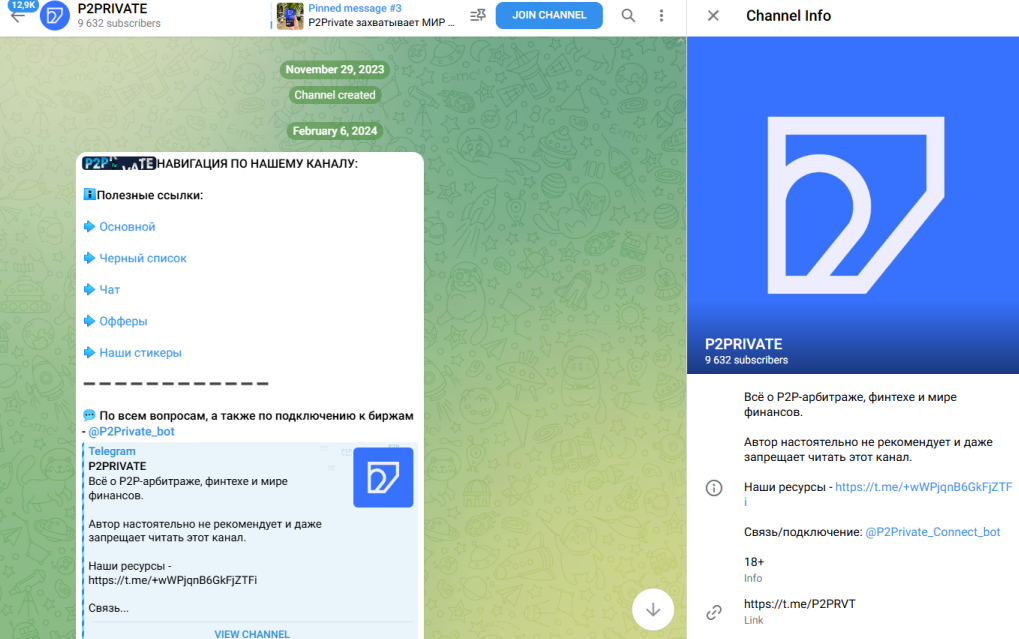 Канал P2PRVT был создан в ноябре 2023 года, и на данный момент на него подписано 9.6 тысяч пользователей, большая часть которых читает посты. Это хороший показатель заинтересованности в блоге.