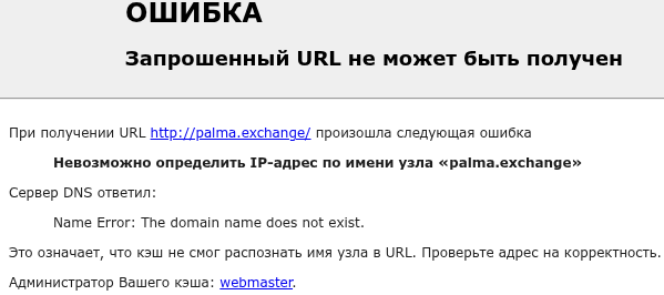 Однако получить более детальную информацию по сотрудничеству через страницу не получилось, потому что поисковый робот удалил ее из выдачи. Как правило, такое происходит из-за большого количества жалоб. Мы все же попытались зайти на сайт, но вместо данных по сотрудничеству получили предупреждение об удалении.При переходе по ссылке на проект получили следующую ошибку — «Запрошенный URL не может быть получен. Невозможно определить IP-адрес по имени узла Palma Exchange».