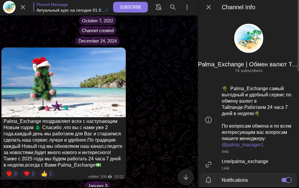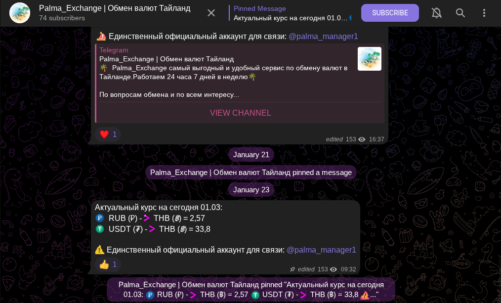 Через телеграмм обменника Palma Exchange можно покупать и продавать электронные доллары USDT, рубли, тайские баты. Курс зависит от рыночной ситуации. В последней публикации от 23 января 2025 года прайсовые котировки следующие: