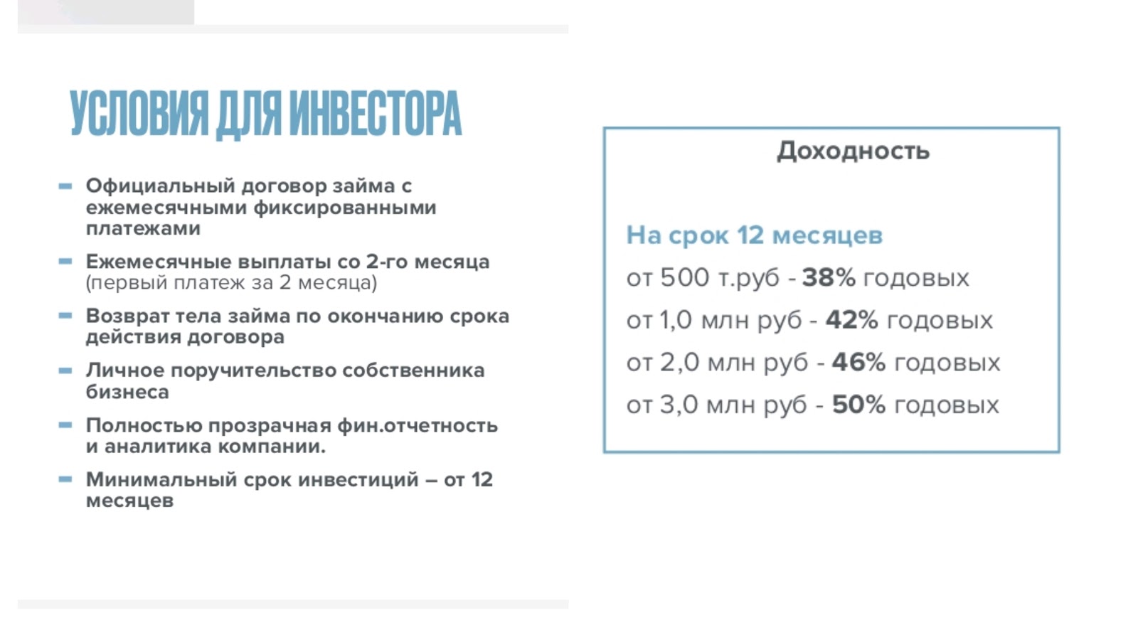 Парфюмир РФ — это оптовый производитель парфюмерии, который принимает заказы по странам СНГ. По словам основателя, ежемесячная выручка компании составляет от 6 млн рублей. Инвесторам предлагают получать до 50% годовых в зависимости от выбранного варианта сотрудничества, и далее мы расскажем о деятельности проекта в деталях.