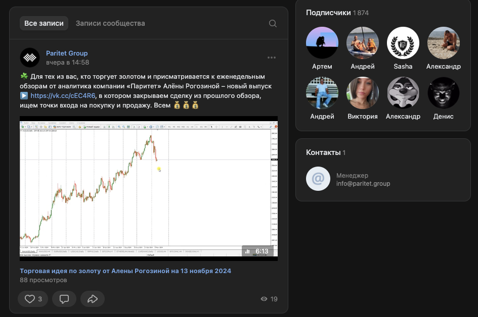 На страницу Paritet Group во «ВКонтакте» подписано около 1,87 тысяч человек. Но публикации видит лишь небольшая часть этой аудитории. Примерно за сутки посты компании «Паритет» в VK собирают около 20-и показов.