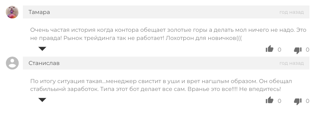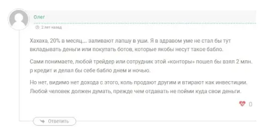 Например, некий Олег писал, что фирма «заливат лапшу в уши». Он предъявляет претензии из-за того, что компания обещает нереалистично высокую доходность в 20% в месяц.