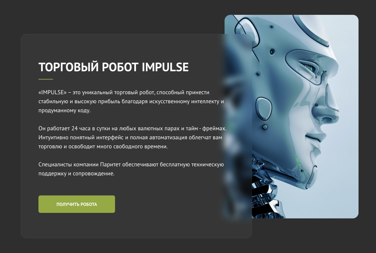«Паритет Групп» – организация, которая оказывает комплекс услуг, связанных с инвестированием: обучение, консультирование и продажа торговых роботов. Компания официально зарегистрирована.