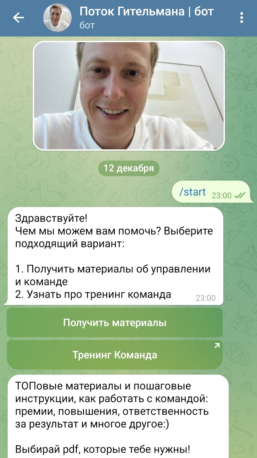Также есть телеграм бот PotokGitelmanabot. В нем можно получить обучающие материалы для самостоятельного изучения. Они предоставляются бесплатно. Также можно записаться на тренинг “Команда”. Для этого надо указать свой номер телефона. Все нюансы обсуждаются с учеником лично.