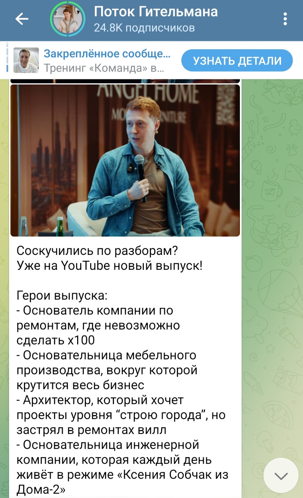 У Гительмана есть канал в Телеграм Potok gitelman. В нем Павел обещает делиться внутренними документами и фреймворками, которые использует в своем бизнесе, рекламирует тренинг “Команда”. Аудитория составляет 24,8К человек. Посты просматривает около 2К или 8% подписчиков. Реакции ставит не более 20 человек, а комментарии пишут единицы. Такие показатели характерны для каналов с накрученной аудиторией.