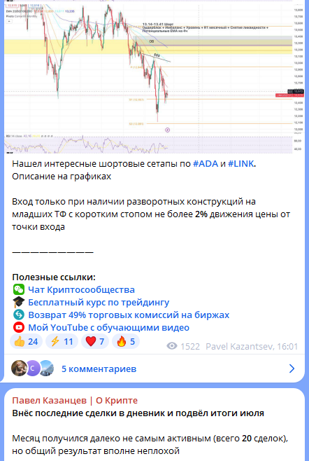 В основном телеграмм-канале с 19 тысячной аудиторией, Павел Казанцев вещает о крипте и трейдинге, но несколько уже чем на ютубе: без теории в принципе, только практика – зашел, вышел, вот профит. Такой подход позволяет перенаправлять трафик и делить аудиторию на любителей и условных профессионалов.
