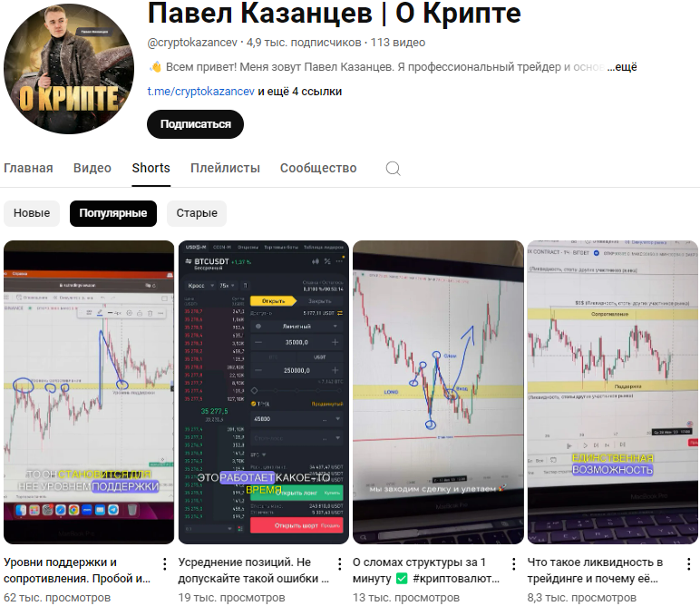 Ютуб-канал Cryptokazancev имеет аудиторию почти в 5 тысяч подписчиков, большая часть из которых пришла из популярных шортсов о структуре рынка. Помимо коротких видео, на канале лежат записи бесплатных вебинаров, разборы монет и мастер-классы.
