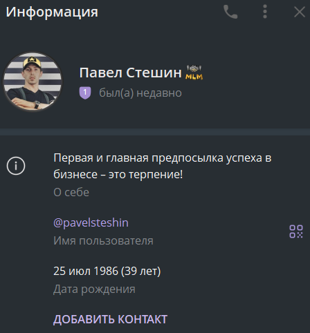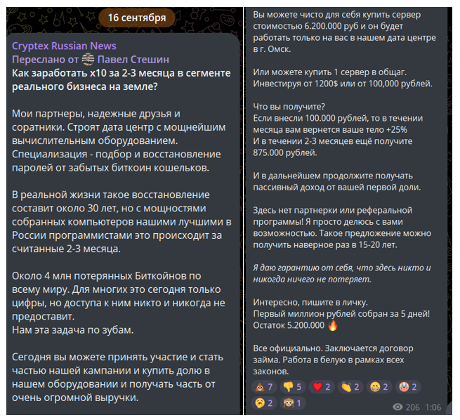 Собственный проект Pavelsteshin в Телеграм – это услуги по получению утраченного доступа к Биткоинам. Павел делает рассылку в социальных сетях, где предлагает инвестировать в покупку оборудования по поиску и подбору ключей к кошелькам с криптовалютой.