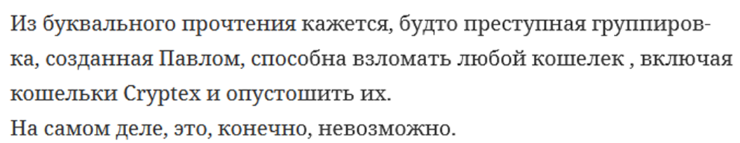 Павел, работающий ранее с этими биржами, предлагает услуги по возврату, обещая, что все первоначальные вложения вернутся с увеличением в 10 раз. Он утверждает, что сам потерял более 6 тысяч у.е. на работе с Cryptex. Никаких подтверждений и описаний своего метода он не предлагает. Более того, имеют место признаки манипулирования мнением.Стешин утверждает, что в Омске его друзьями и партнерами ведется строительство мощного дата-центра. Основная специализация — восстановление забытых паролей к криптокошелькам. К работам привлекают якобы лучших программистов, что позволяет всего за несколько месяцев получить доступ и вернуть Биткоины.