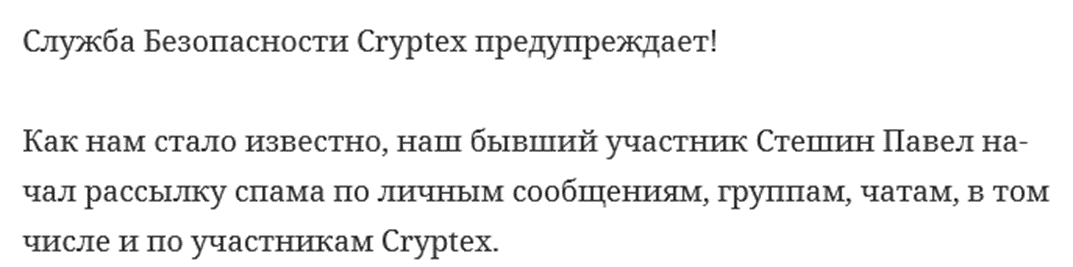 Найти независимые отзывы о работе Павла Стешина в сети не удалось. Но есть обращение СБ компании Cryptex, где он раньше работал. В заявлении говорится о том, что Павел начал рассылку спама с предложениями о поиске потерянных Биткоинов и взломе кошельков, к которым утрачен доступ. Сообщения рассылаются по клиентам Cryptex, в чатах и группах. Также Cryptex утверждает, что уход Павла из их проекта связан с обманом. На такие же обстоятельства они ссылаются и по поводу увольнения из проекта Syntech.