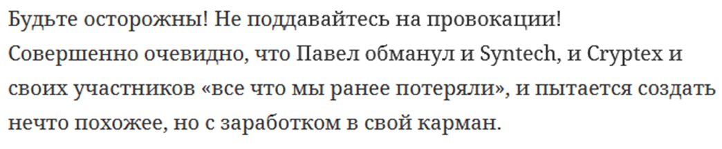 - о деятельности самого Павла известно крайне мало, ранее он работал с проектами Cryptex и Syntech, репутация у которых неоднозначная;
